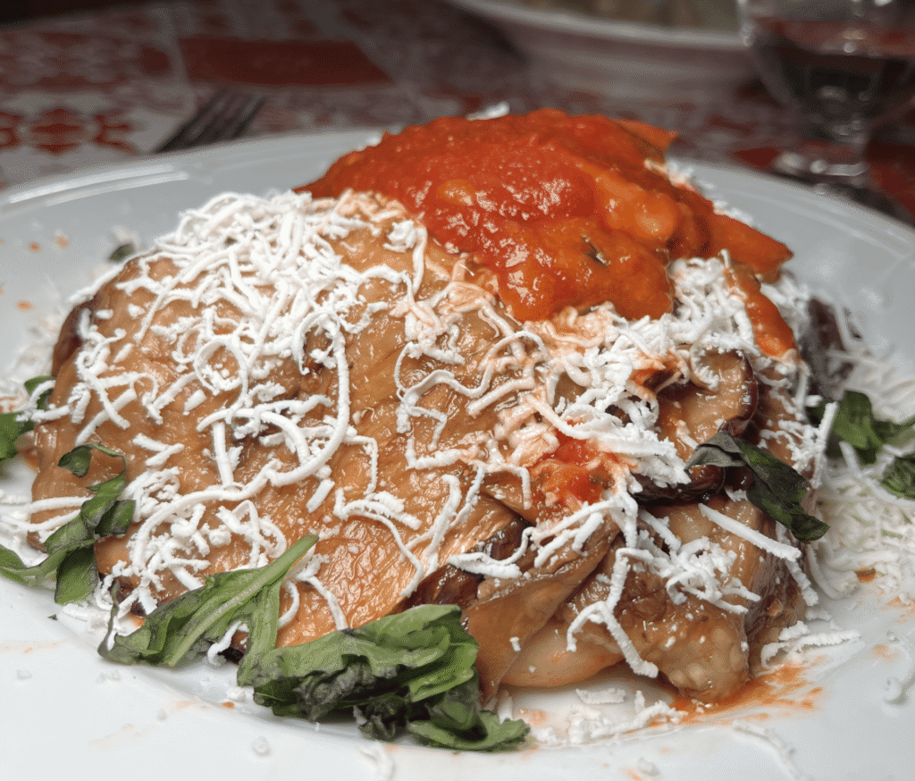 La pasta viene ancora fatta in casa ed è servita con abbondante sugo rosso, melanzane fritte e formaggio, una vera libidine.