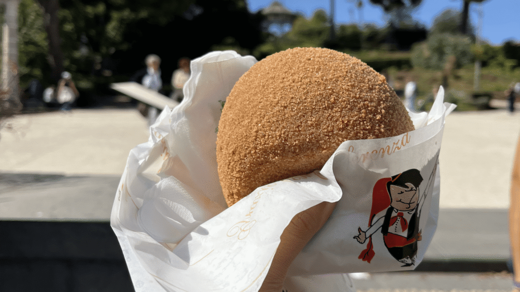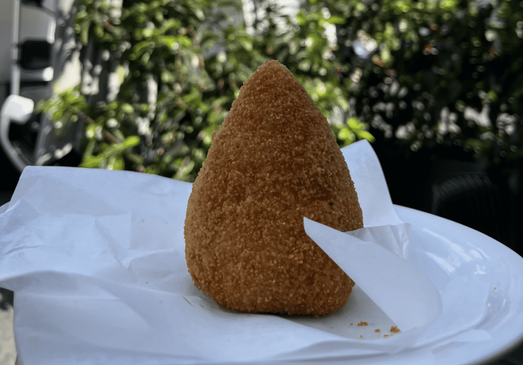 - Arancino: L’arancino, perchè a Catania è maschio, è il re indiscusso dello street food tipico siciliano. Una palla di riso fritta, farcita nella ricetta tradizionale con ragù, carne, piselli. La sua forma un pò allungata celebra l’Etna.